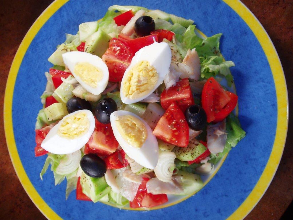 Na ledový salát (80 g) nakrájený na velké kostky, rozprostřený po talíři, poklaďte 1 rajče (cca 70 g), 5 cm okurky (cca 80 g), ½ papriky na kousky (100 g), 1/3 menší cibule na kolečka (cca 20 g), 1/3 tuňáka ve vlastní šťávě, 1 rozčtvrcené vejce natvrdo a kapary (asi lžičku – 5 g).