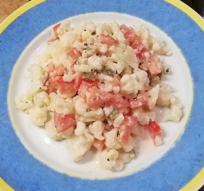 Květák povařte v osolené vodě. Mezitím si nakrájejte 1 rajče (70 g) na kostičky a vložte do mísy. Slijte květák a rovněž ho pokrájejte a přidejte k rajčeti.