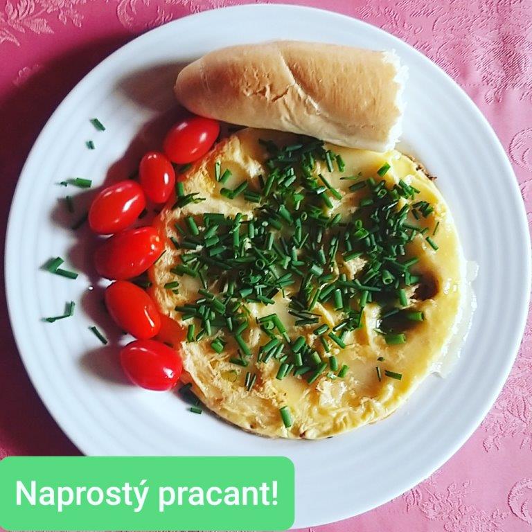 1/2 větší cibule, 2 kusy loštických tvarůžků, 2 vajíčka, pálivá paprika dle chuti, 1 lžíce tuku (10 g) na smažení. Digestoř zapněte na nejvyšší rychlost, cibuli nakrájejte na kolečka a v hrnku rozkvedlejte vajíčka s troškou soli. Na pánvičce na oleji zesklovaťte cibuli, pak zalijte vejci a v rychlém sledu rozklaďte dokola tvarůžky, přikryjte pokličkou, pečte pomalu. Omeleta je krásně nadýchaná. Po přiklopení pokličkou klidně vypněte ploténku.