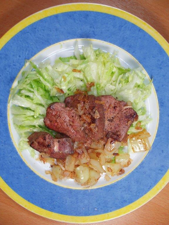 Na talíř připravte ledový salát (80 g), který zastříknete balzamikovým octem a citrónovou šťávou. Nakrájejte si menší cibuli (30 g) a půlku papriky (80 g) na větší kostky. Dále naporcujte 60 g jater na malé medailónky. Na 1 lžíci oleje (10 g) opékejte nejdříve cibuli a papriku. Jakmile cibule trochu zesklovatí, přidejte opéci i játra. Ta jsou během dvou/tří minut hotová. Celou směs dosolte, opepřete a teplou položte na salát.