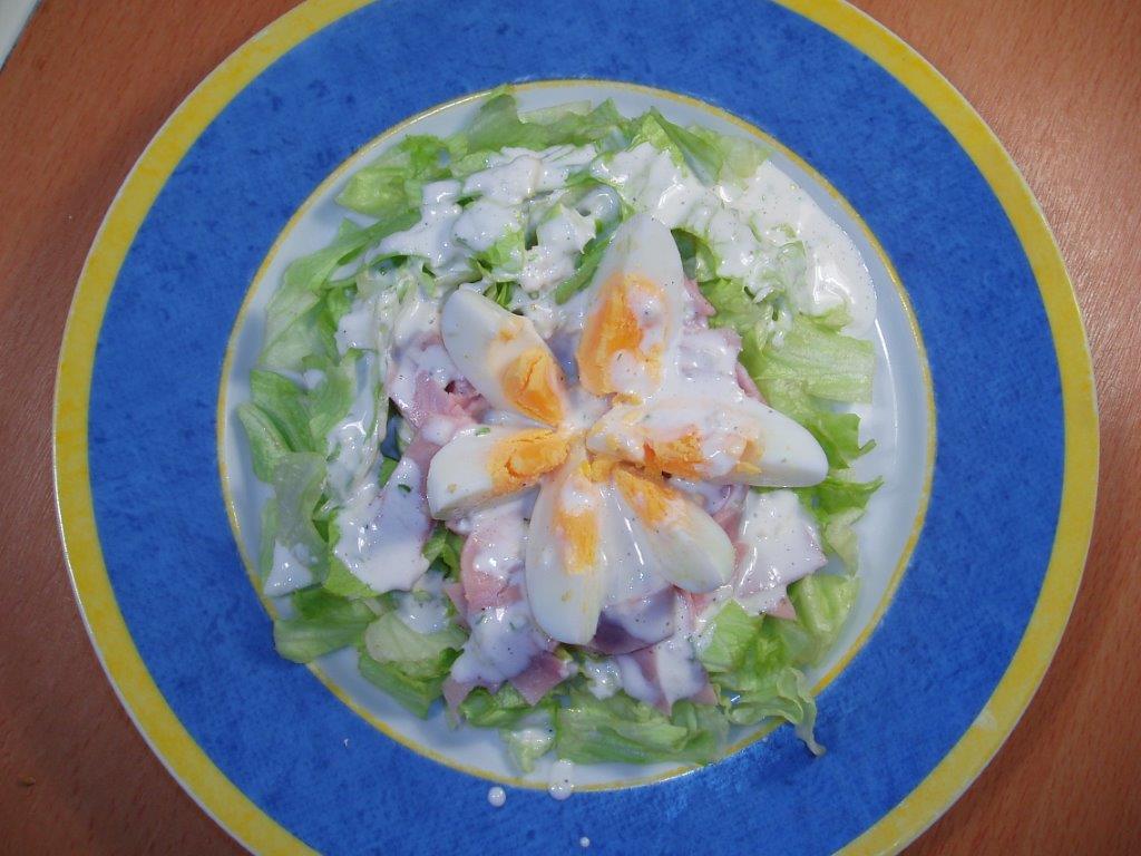 Ledový salát pokrájený na větší kostky (100 g) rozprostřete po talíři. Vejce a kuřecí/krůtí šunku (50 g) pokrájejte na menší kousky a posypte jí ledový salát. V mističce smíchejte 30 ml mléka a 1 lžíci majonézy (10 g) se stroužkem lisovaného česneku, solí a pepřem. Zálivkou přelijte směs na talíři.
