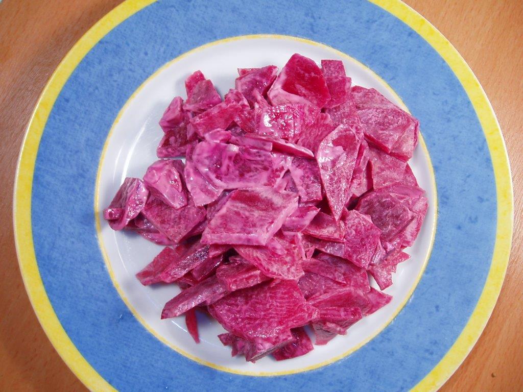 2 bulvy řepy (300 g) oloupejte a rozkrájejte na měsíčky, dejte vařit do vody, kterou předem ochutíte 1 lžící octa (10 g), 1 lžičkou soli (5 g) a 1 lžičkou cukru (5 g). Vaří se poměrně dlouho. Potom ji nakrájejte na menší kousky a smíchejte se lžící zakysané smetany – 20 g, opepřete a přidejte špetku zázvoru.